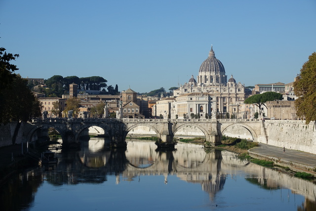 - 테베레 강변에서 성 베드로 대성당을 바라본 전경. 브라만테, 라파엘로, 상갈로, 미켈란젤로, 마데르노 등 5대 거장의 손길을 거쳐 완성한 성 베드로 대성당은 오늘날 가톨릭교회의 중심이 됐다. 강한수 신부 제공