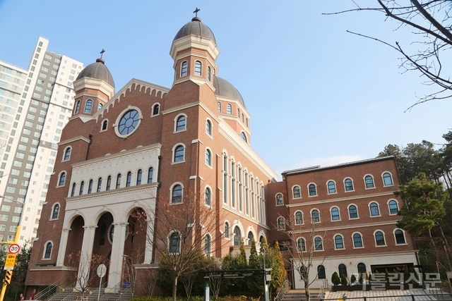 - 광교1동성당은 현대적인 빌딩과 아파트들 사이로 아치와 돔 형식의 고전적인 양식으로 눈길을 끈다. 박효주 기자