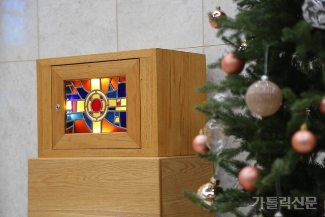 - 제단 위 성탄 트리 너머에는 감실이 주황색과 노란색으로 표현된 따뜻한 색감의 십자가와 둥근 성체로 빛나고 있다. 박효주 기자