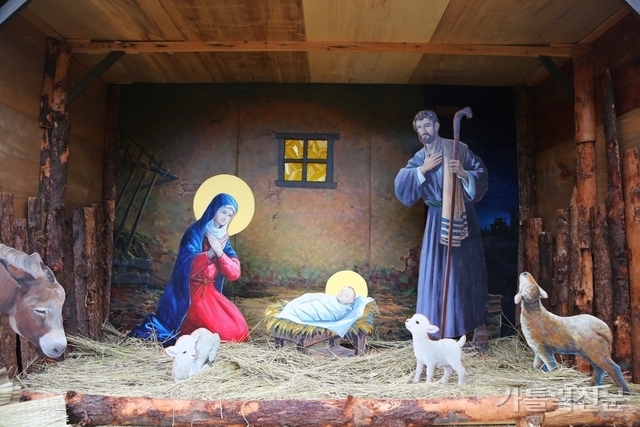 - 마리아 광장에 설치된 구유는 3차원의 나무 외양간 안에 2차원의 인물과 동물 그림 패널로 만들어졌다. 박효주 기자