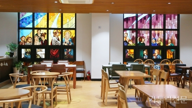 - 1층 카페에는 바깥을 향하는 유리 벽 전체에 ‘가나의 혼인 잔치’를 그린 대형 스테인드글라스가 수놓여 있다. 박효주 기자