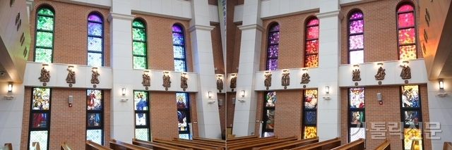 - 대성전 내부의 왼쪽 창들은 초록색과 파란색으로 성령의 ‘바람’을, 오른쪽 창들은 보라색과 붉은색으로 성령의 ‘불길’을 나타낸 듯한 생각이 든다. 박효주 기자