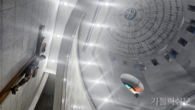 - 대성전 내부에는 기둥이 없는 데다 제대 위쪽으로 돔 천장이 형성돼 있어 공간감을 선사한다. 박효주 기자
