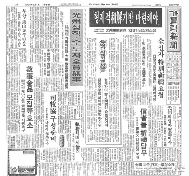 그날 가톨릭신문 1면에 ‘광주 사태’에 관한 기사들이 대부분을 차지했습니다. 여기에서는 5월 23일 긴급 소집된 주교회의 상임위원회를 거쳐 발표된 특별기도 요청 서한을 ‘형제적 화해(和解) 기반 마련해야’라는 제목의 1면 톱기사로 전했습니다.