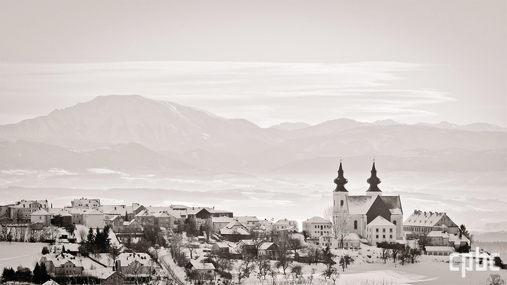 - 눈 덮인 마리아 타펄 바실리카. 해발 450m(강 기준 233m) 니벨룽겐가우 언덕에 자리하고 있어서 성당 마당에서 도나우강 너머 넓은 구릉지대가 한눈에 들어온다. 강을 따라 서쪽으로 시선을 돌리면 멜크 수도원이 어렴풋이 보인다.