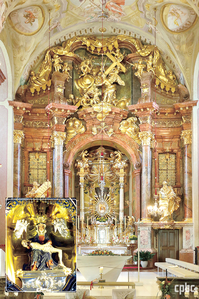 - 마리아 타펄 바실리카의 주 제대와 은총의 피에타상. 성모 신심의 중심이 된 은총의 피에타를 모신 참나무 자리에 주 제대를 조성했다. 성당의 주 제대가 동쪽이 아니라 북쪽에 자리한 것도 이 때문일 수 있다. 1734년 파사우 출신의 조각가 요제프 마티아스 괴츠가 설계했으며, 린츠의 건축가 요한 미하엘 프룬너와 금세공인 요한 페터 슈벤터의 참여로 1739년에 완성되었다.