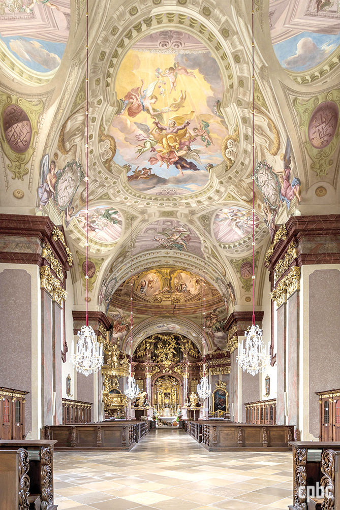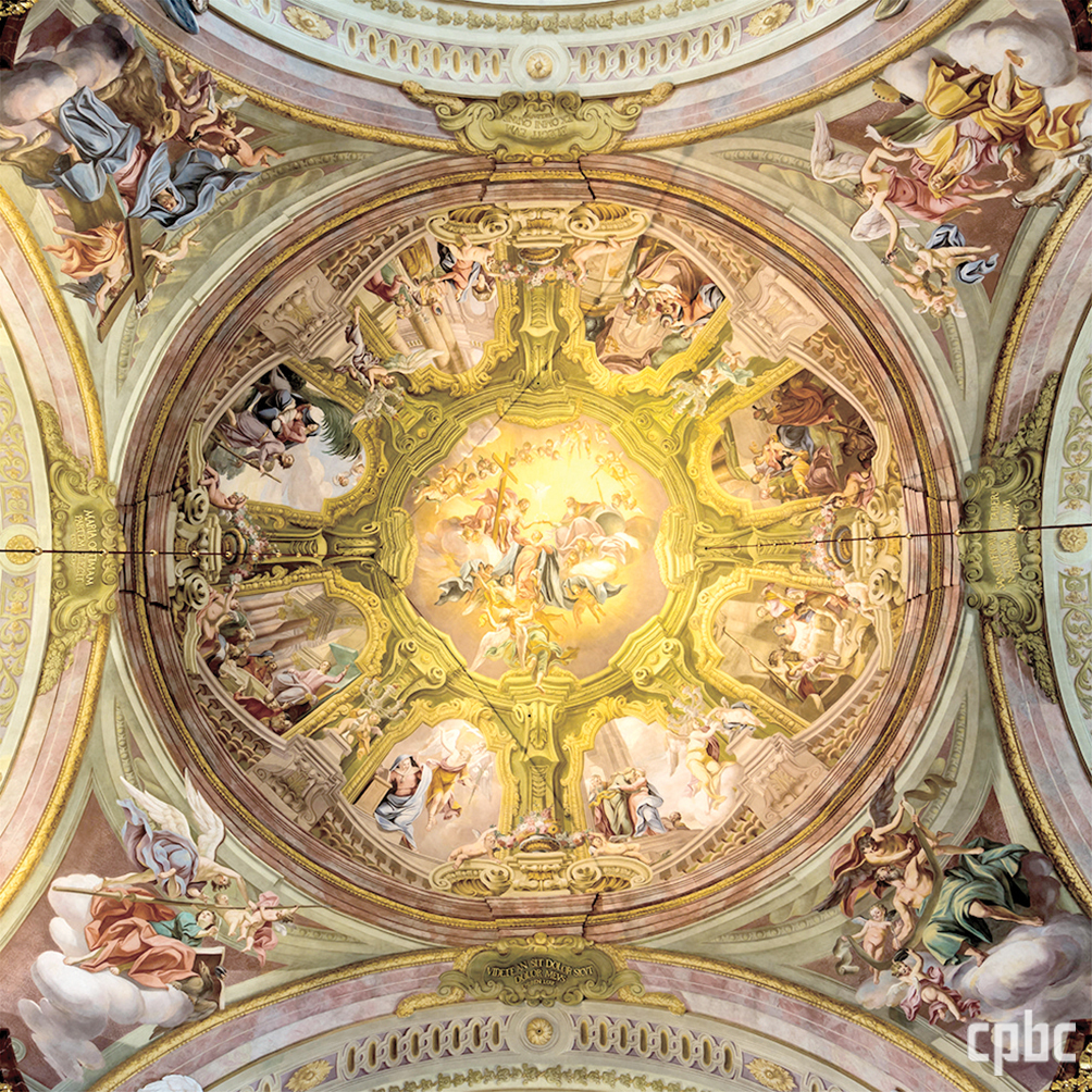 - 단일 신랑의 짧은 교차랑 구조인 마리아 타펄 바실리카. 1713~1718년 기존의 석고 장식을 걷어 내고, 안토니오 베두치의 밑그림대로 벽면과 천장을 하나의 천상 무대로 구현했다. 교차랑 위의 돔 천장에는 성모 승천과 성모의 삶, 신랑의 천장에는 성 요셉의 영광이 묘사되어 있다.