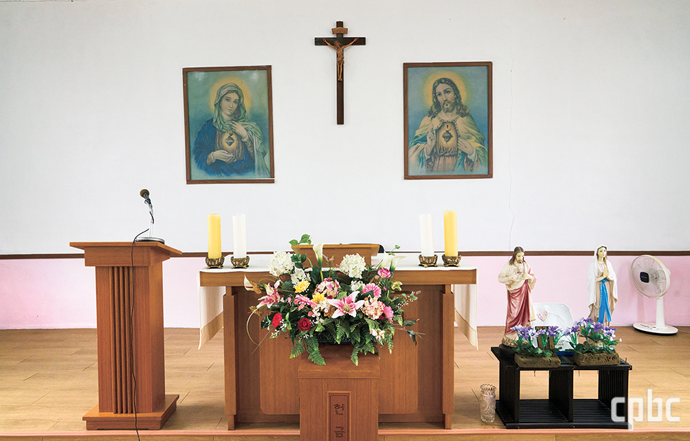- 제대 옆 작은 탁자에 마련돼 있는 예수 성심상과 성모상, 그리고 성 요한 바오로 2세 교황의 모습이 그려진 장식 접시.