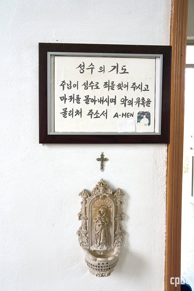 - 입구 성수대와 기도문. 세월의 흔적을 가늠해주는 아름다운 성물이다.