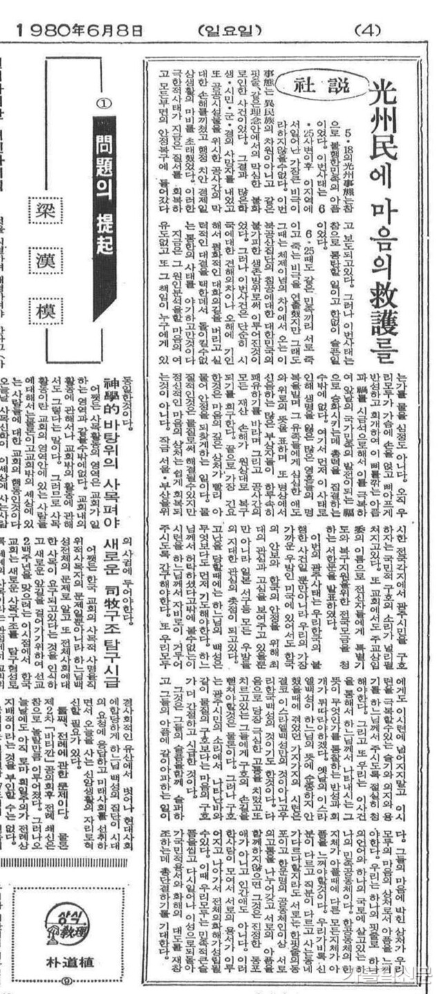 더욱 심각한 것은 사태를 바라보는 시각이었습니다. 6월 8일자 사설은 이번 사태가 “견해 차이나 오해로 인해 대화 대신 대결을 택한 탓”이라며, 책임 규명조차 무의미하다고 썼습니다. 심지어 “이스라엘 백성이 하느님의 뜻에 순종하지 않아 겪었던 시련은 우리 한국 백성의 것이기도 하다”며 광주의 비극을 하느님이 주신 시련인 양 묘사했습니다. 이는 광주 시민들의 저항을 비이성적 대결로 치부하고, 신군부의 책임을 희석시키는 보도였습니다.