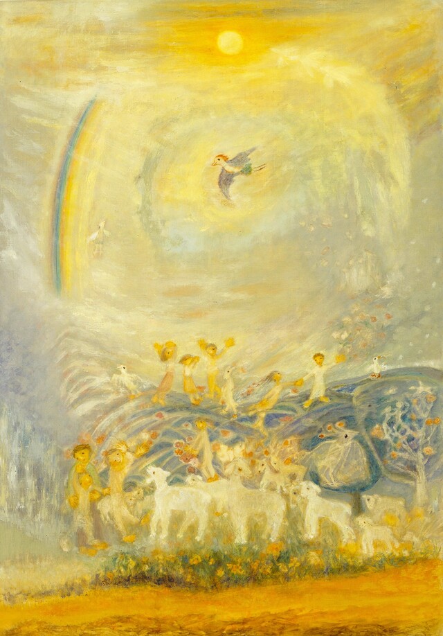 여기 황금빛 하늘을 자유로이 나는 새가 있습니다. 좌측 앞에 드리워진 환상적인 무지개를 향해 날개를 활짝 펼치고 유유히 나는데 입가에 미소를 머금은 행복한 모습이네요. 그 아래 지상에는 굽이굽이 산새가 우거진 오색찬란한 자연이 펼쳐지고, 산 중턱의 꽃이 만발한 들판의 아이들이 순백의 양들, 신비로운 생명체들과 함께 뛰노는 모습이 정겹습니다. 이는 바로 송경이 유년 시절을 보낸 서울 삼청공원을 연상시킵니다. 유다계 러시아 화가 마르크 샤갈(Marc Chagall, 1887~1985)이 평생 그리워하며 화폭에 담은 고향마을 비테브스크와 같이 말이지요.