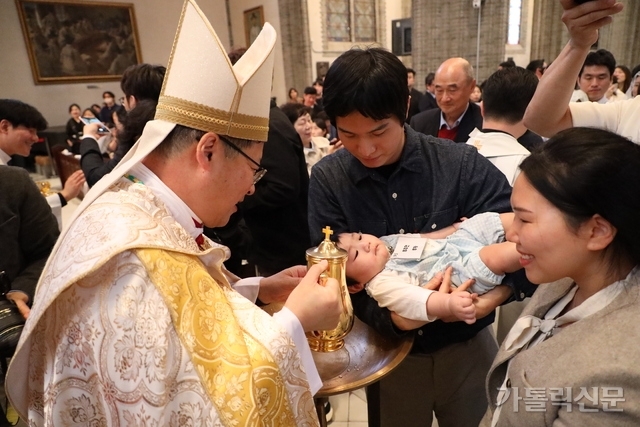 - 어느 그리스도교에서 세례를 받든지 적법한 방식으로 이뤄진 세례라면 가톨릭교회에서도 유효하다. 2025년 5월 5일 서울대교구 영유아·어린이의 희년 행사 중 정순택 대주교가 어린이에게 세례를 주고 있다. 가톨릭신문 자료사진