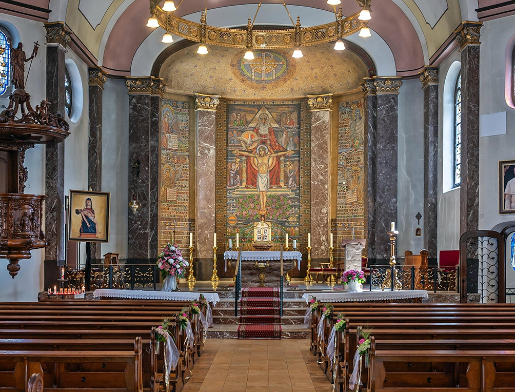 성당 안은 외관과 달리 정돈된 분위기입니다. 본당과 후진, 교차랑은 아치형 천장으로 이어지고, 교차부 위로 돔이 솟아 공간의 중심을 잡고 있습니다. 시선은 제단 뒤 별무늬가 흩어진 금빛 바탕 위로 곧게 솟은 십자가를 형상화한 모자이크로 향합니다. 1942년에 제작된 벽화인데, 가장자리의 “때가 오고 있으니 바로 지금입니다”(요한 5,25)란 문구에서 전쟁의 불안 속에서도 죽음이 끝이 아니라는 약속에 매달리려 했던 마음이 읽힙니다.