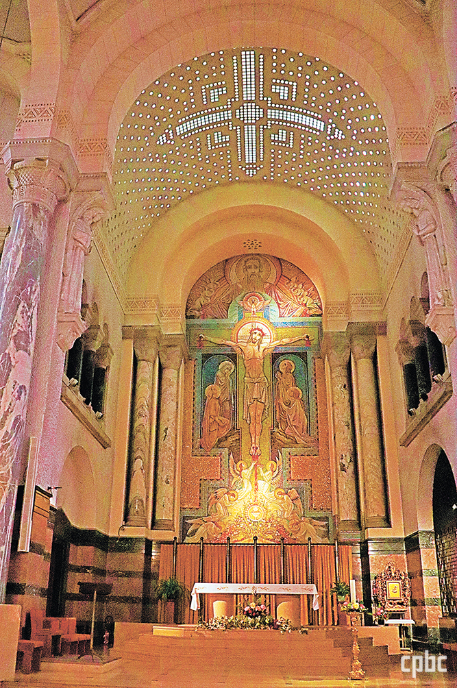 - 주 제대와 예수 수난 모자이크. 후진 벽면을 덮는 대형 모자이크는 네덜란드의 대표적 모자이크 장식가 앙투안 몰켄보어의 기념비적 작품으로 1935년부터 제작해 1958년경에 완성됐다. 제대 감실은 ‘이사이의 그루터기’ 형상 위에 놓여 구원의 역사가 한 줄기에서 뻗어 나온다는 이미지를 드러낸다.