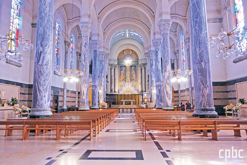성당 내부는 푸른색 톤의 대리석 기둥들 사이로 빛이 머무는 자리를 마련해 둔 듯합니다. 주 제대로 나아가면서 보이는 좌우의 스테인드글라스에서 이곳 공동체가 어떻게 시작되었는지 알 수 있습니다.