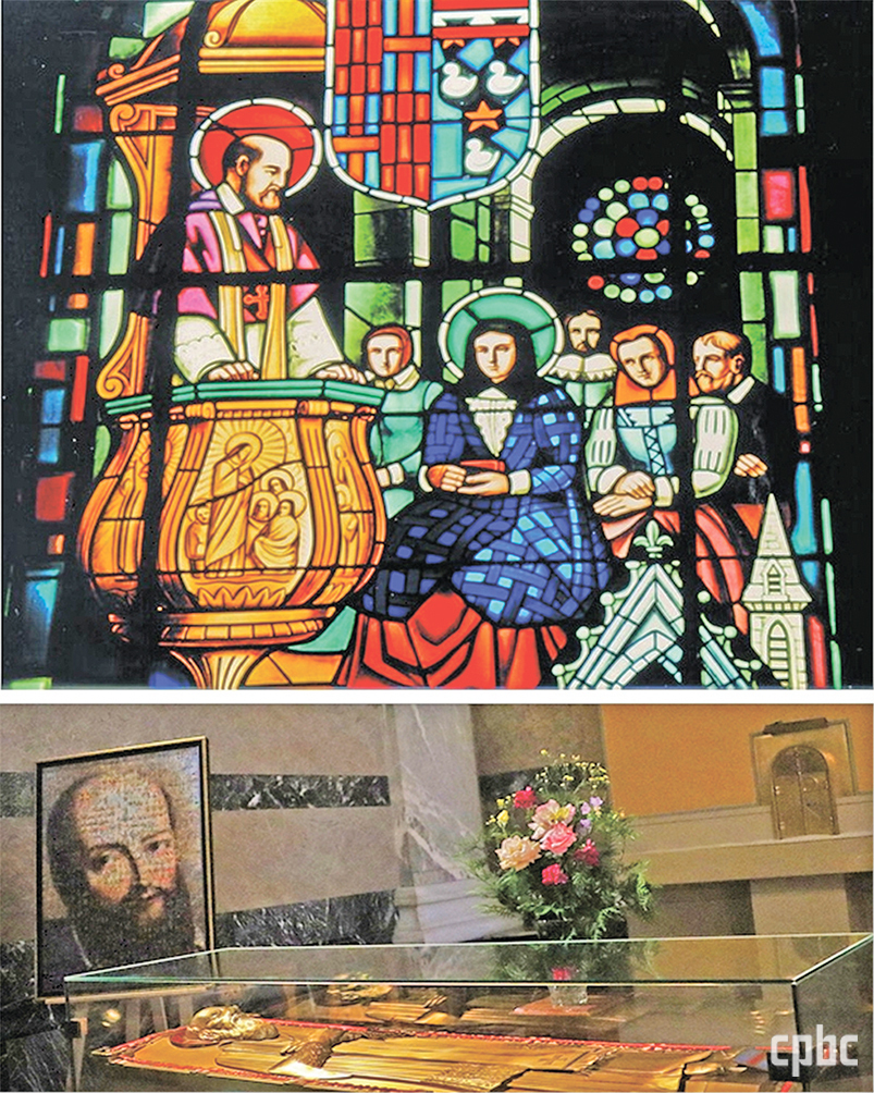 - 프란치스코 살레시오 주교와 요안나 프란치스카 드 샹탈의 만남을 그린 스테인드글라스(위)와 성 프란치스코 살레시오 성해(아래). 과부로서 네 자녀를 키워낸 드 샹탈은 1604년 프란치스코 살레시오를 만나 영적 우정을 쌓았고, 1610년 고행보다 온유와 겸손, 일상의 작은 덕행으로 하느님께 나아가는 길을 강조하는 성모 마리아 방문 봉쇄 수녀회를 공동 설립했다. 경기도 연천을 포함해 오늘날 전 세계 150여 곳에 수녀원이 있다.