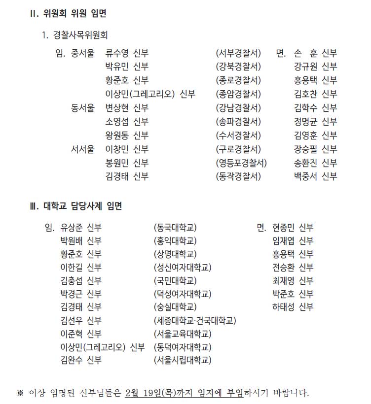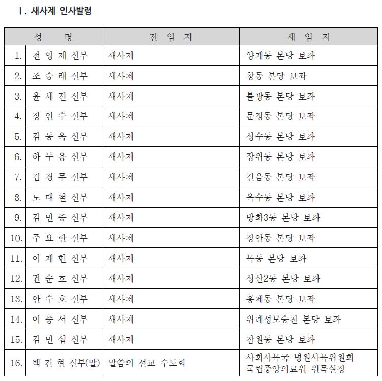 † 찬미예수님 천주교 서울대교구에서는 02월 06일 16분의 새사제에 대한 인사발령을 단행하였습니다. 발표일자 : 2026. 02. 06(금) 부임일자 : 2026. 02. 19(목) PDF파일을 읽을 수 없을 경우 PDF뷰어 설치 후, 조회 가능합니다.