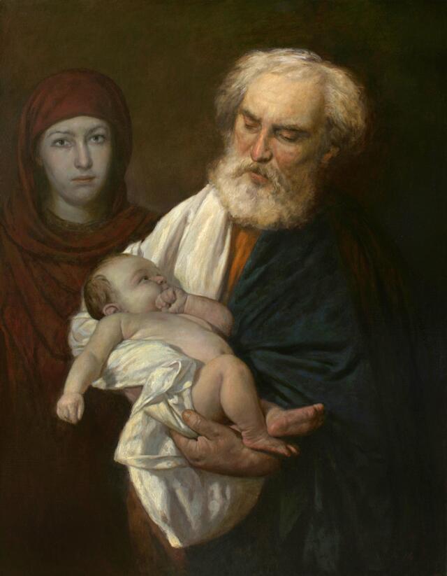 - 러시아 화가 안드레이 미로노프가 그린 〈시메온과 아기 예수〉. 아기 예수님을 안고 있는 시메온(오른쪽) 옆에 고뇌와 충격에 잠긴 성모 마리아의 표정이 인상적이다. 시메온의 예언에서 훗날 아들을 잃게 될 것을 알게 된 어머니의 슬픔이 느껴진다. 출처 위키미디어