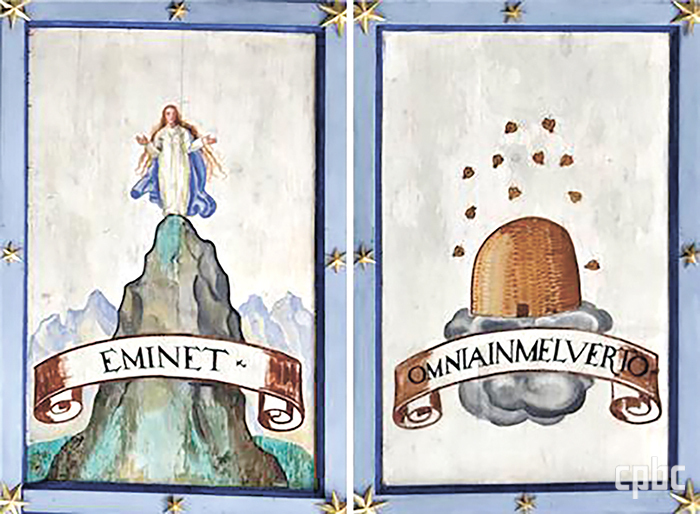 - 천장 패널 ‘그림의 하늘’ 중 산 위의 성모(남쪽 48)와 벌집(남쪽61). 선택과 거룩함으로 성모 마리아를 “모든 산 위에 솟은 산(mons altissimus)”으로 묘사했다. 성인들 가운데 가장 높은 자리를 상징하며, 두 팔을 펼친 모습은 자비와 보호의 상징이다. 벌집의 “나는 모든 것을 꿀로 만든다(OMNIA IN MEL VERTO).” 모토는 벌이 꽃에서 꿀을 모으듯, 사람들 안의 선을 길러 삶을 달콤함으로 변화시키는 성모의 은총을 상징한다.