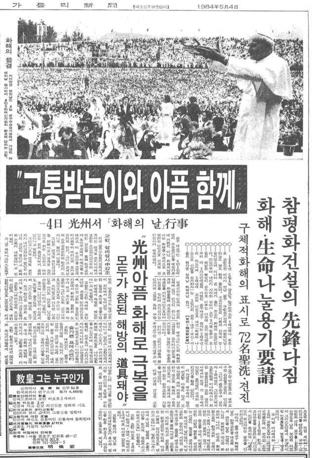 “순교의 터전에 감격의 입맞춤, 교황 요한 바오로 2세 3일 김포공항 도착 - 믿음과 소망과 사랑과 평화의 사도는 조용한 아침의 나라 한반도의 땅을 밟았다. 그리고 이 땅에 입 맞추었다. ‘죽음의 그늘진 골짜기를 간다해도 당신 함께 계시오니 무서울 것이 없나이다’(시편 22)라는 성경 말씀을 따라 무자비한 테러, 전쟁, 파괴, 분쟁 등 온갖 악의 세력, 그 위험을 뚫고 땅끝까지라도 달려가 평화와 사랑의 빛을 비추어온 교황 요한 바오로 2세. 그는 마침내 머나먼 동방의 한쪽 끝, 대한민국에 당도, 이 땅과 이 민족을 축복했다.”(가톨릭신문 1984년 5월 6일자 1면)