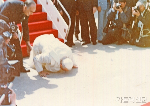 - 성 요한 바오로 2세 교황이 5월 3일 김포공항에 도착해 순교자의 땅에 엎드려 입을 맞추고 있다. 가톨릭신문 자료사진