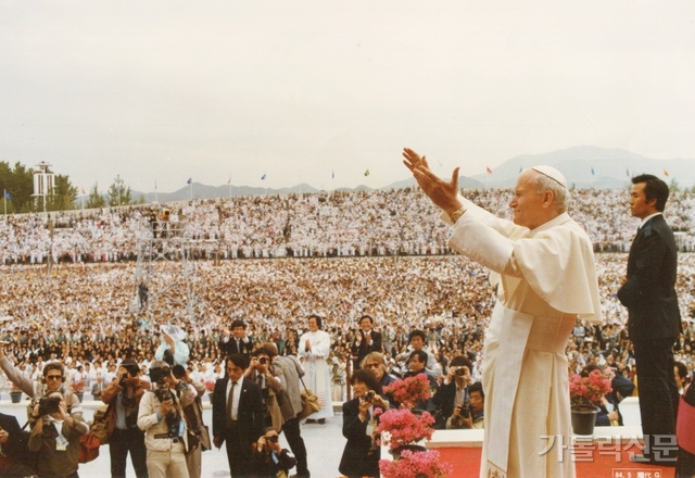 - 성 요한 바오로 2세 교황이 방한 둘째날인 5월 4일 광주 무등경기장에서 거행된 화해의 날 행사에서 신자들의 환호에 응답하고 있다. 가톨릭신문 자료사진