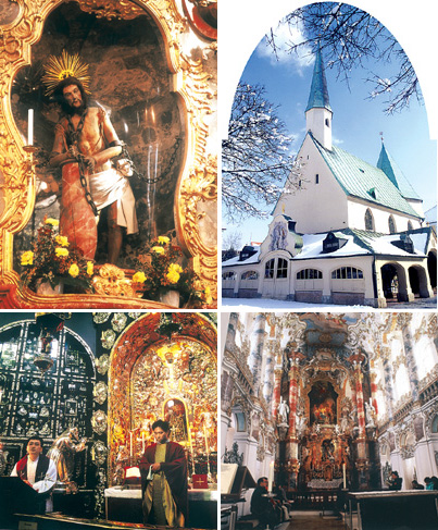 1. 비스성당의 '쇠사슬에 묶이신 예수상.' 1730년께 나무로 조각된 이 예수상은 특이하게도 예수가 십자가가 아닌 쇠사슬에 목과 팔이 묶여 있는 모습을 하고 있다.2. 알퇴팅 은총경당 전경. 700년께 세워진 팔각형 성당 위에 성모의 기적이 일어난 후 순례자들을 위해 고딕 양식 성당으로 증축했다.